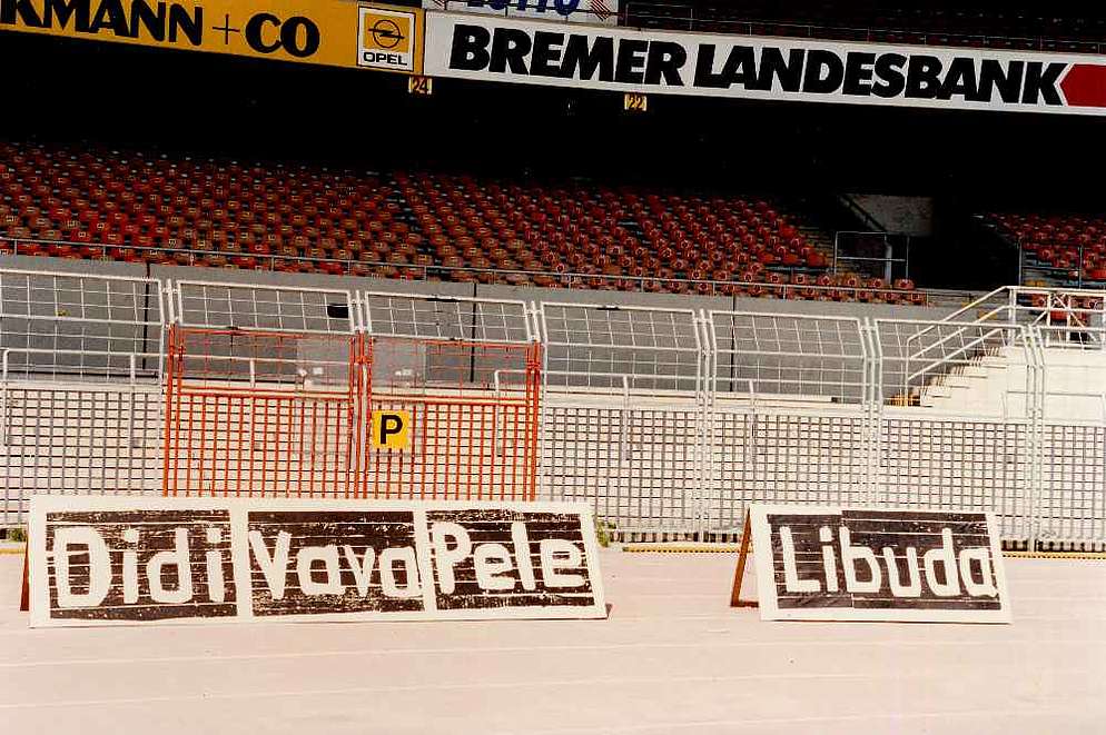 "o.T." Die Sportler-Namen "DIDI-VAVA-PELE-Libuda" wurden von Bogdan Hoffmann aus Bremen mittels Holzdruck auf eine Nesselbahn übertragen, die dann als Bandenwerbung im Weserstadion angebracht wurde.