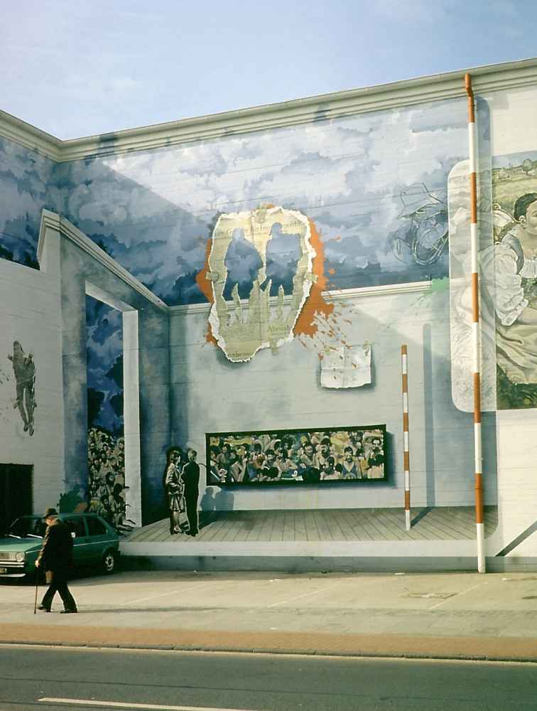 Motive dieses Kontrastpaares hat der Künstler Rolf Thiele als Wandbild collagenartig auf den Bunker in Bremen - Neustadt gesetzt. Der Betrachter sieht die Blutlache eines getöteten Menschen, gefährdete türkische und deutsche Kinder und daneben idyllische Szenen, wie Menschen, die auf einem Feld sitzen, Bäume, Blumen. Den Infanteristen mit Maschinenpistole und den Panzer hat der Künstler aufgrund heftiger Kritik der Anwohner in einer späteren Malaktion umgestaltet. In den Diskussionen ging es um die Frage, ob solche großformatigen Gewaltsymbole, wenn man sie ständig vor Augen hat, auszuhalten sind. In der Manier des Verpackungskünstlers Christo malte der Künstler Verpackungen über die Motive, die jedoch ihre Form darunter erkennen lassen.