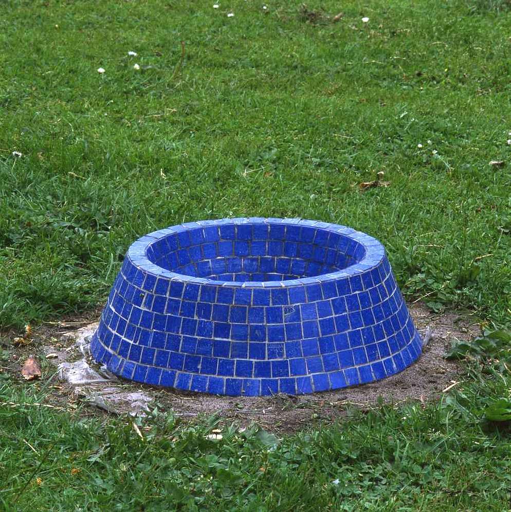 "Hundebrunnen", 9-teilig, Beton, Glasbausteinchen, Farbe, ca. 0,25 m Höhe bis 0,5 m Ø Thomas Stordel platzierte die blau, rot oder gelb gefärbten verschieden großen Hundenäpfe im Rasen der Wallanlagen zwischen Kunsthalle und Altmannshöhe.
