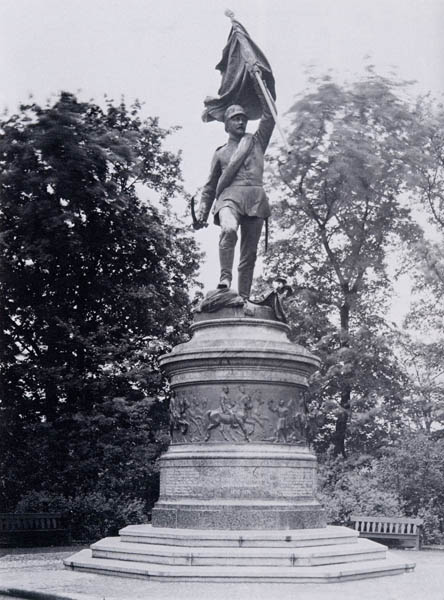 The war memorial 1870/71 was inaugurated on the 5th December 1875 in the Wallanlagen (the former city wall moat). The bronze sculpture of a soldier with a flag and drawn sabre was commissioned by the Senate of Bremen. At his feet lay French war trophies. The cylindrical granite base with a relief frieze made of bronze surrounding was decorated with images of the battle of Sedan. The multi-layered foundation was made from stone.