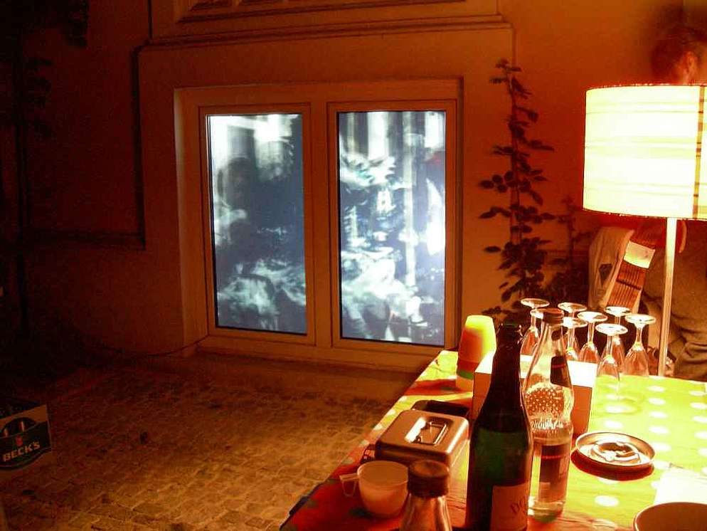 "Spiegel" Videorückprojektion "Eric Dunlap & Chika IIjima gehören der VJ Szene aus New York an. Ihre Beiträge bringen eine ästhetische Vorstellung von der anderen Seite des großen Teiches in die Bohnenstrasse und verbinden so über Kunst verschiedener