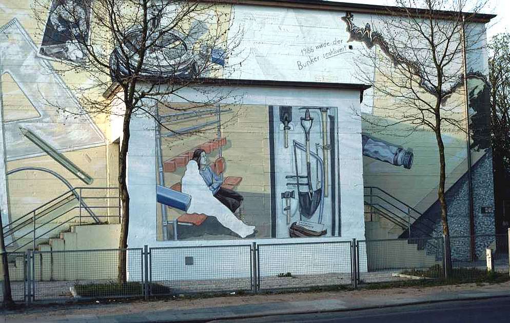Die montageartig zusammengesetzten Bilderfolgen des Wandbildes zeigen Szenen aus der Geschichte der sogenannten Westfalensiedlung, die hinter dem Bunker liegt und den Bremern auch als Klein-Mexiko bekannt ist. Das Zentralmotiv auf der Längsseite des Bunkers zeigt eine Szene des Straßenfestes 1979 in der Wupperstraße. Der Betrachter schaut auf eine Tischplatte, auf der Zettel und Fotos liegen: Sie zeigen Motive des Straßenfestes sowie Darstellungen aus der Geschichte der Siedlung von ihrer Gründung 1927 über den Krieg, den Wiederaufbau bis in die 80er Jahre. Auf dem Wandbild auf der Stirnseite des Bunkers spielen zwei Mädchen fröhlich im Sandkasten. Im oberen Teil des Bildes zeigen sich Brandspuren, die die Idylle trüben - ein Verweis der Künstler auf die Bedrohung der Menschen und der Natur durch das Reaktorunglück Tschernobyl 1986.
