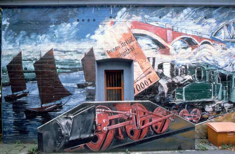 Das Wandbild von Jürgen Schmiedekampf erzählt die Geschichte der Kleinbahn "Jan Reiners", die die Moordörfer mit Bremen verband. Die Kleinbahn war nach dem Ökonomierat Jan Reiners benannt, der den Bau erkämpft hatte. Sie verkehrte von 1900 bis 1954 zwischen Findorff und Tarmstedt am Rande des Teufelsmoors. Auf der West- und Längsseite des Bunkers werden der Torftransport durch die alten Kähne und ihr Ersatz durch die Bahn gezeigt. Dies führte durch Gleise und Brücken zu einer Veränderung der Landschaft. Auf der Ostseite des Bunkers posiert eine Menschengruppe in historischen Kostümen vor einer Dampflok.
