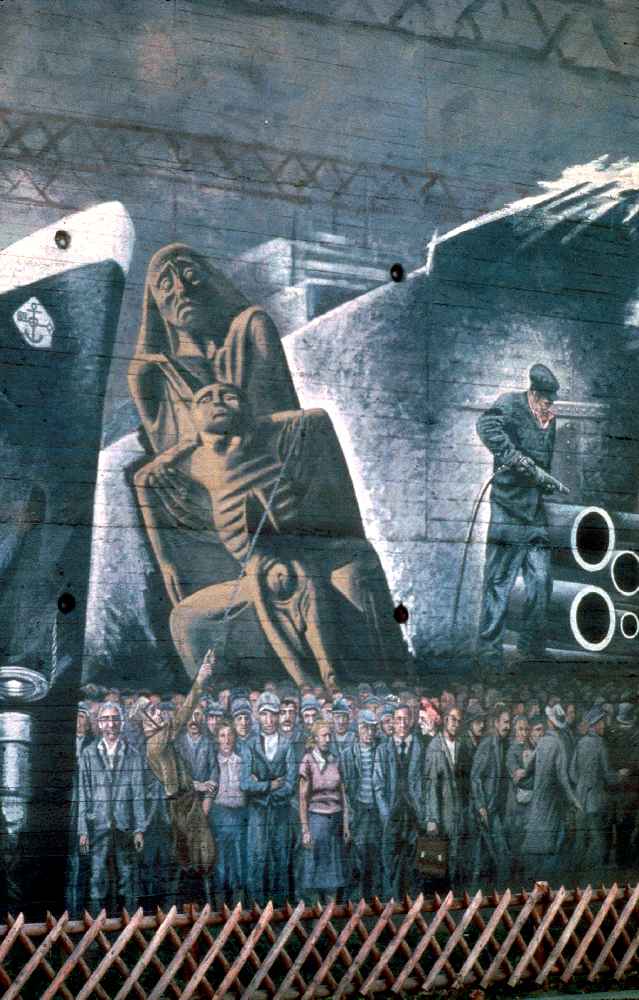 Jürgen Waller und StudentInnen der Hochschule für Künste (ehemals Hochschule für gestaltende Kunst und Musik) malten die Geschichte der ehemaligen Bremer Traditionswerft "AG-Weser". Basierend auf altem Fotomaterial, zahlreichen kunsthistorischen Zitaten und Recherchen erschloss sich ein realistisches Geschichtsbild: