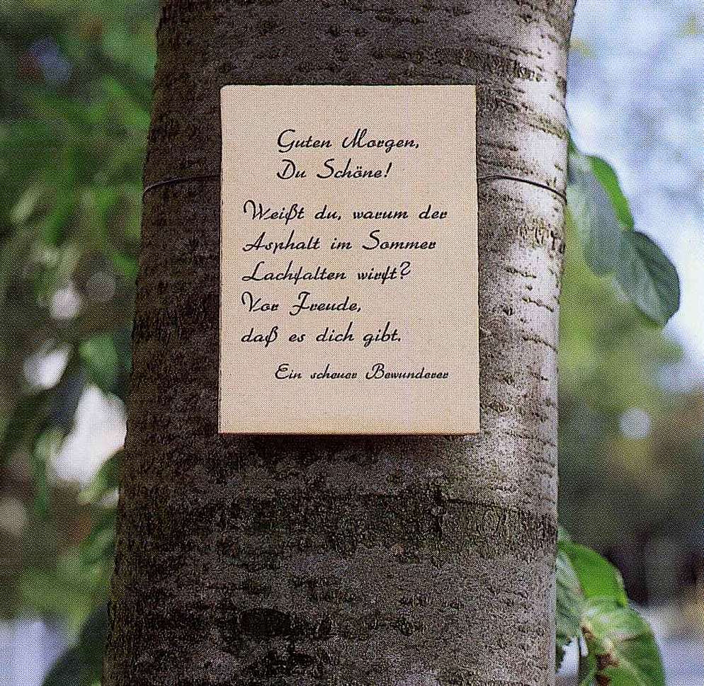 "Baumpost", lackiertes Bütten-Papier, 6-10-teilig, je 0,25 m x 0,18 m Anna Reckmann druckte vier alltägliche Botschaften von Menschen an Menschen auf vier schilderartige Büttenpappen. Die unterschiedlichen Schrifttypen suggerierten verschiedene Schreib