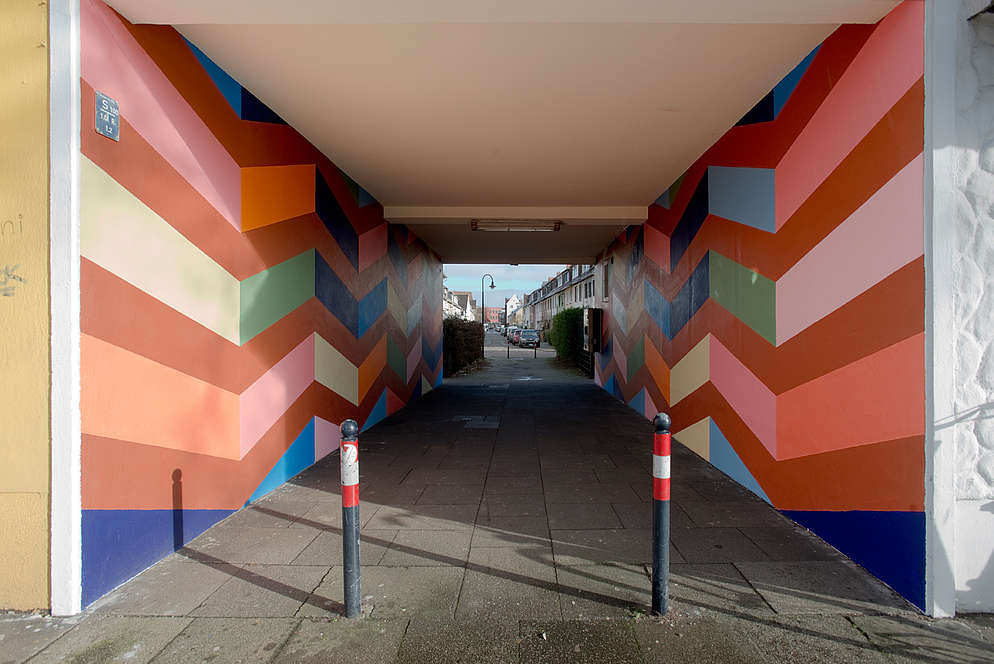 Die Bremer Künstlerin Edeltraut Rath realisierte die Gestaltung des Gebäudedurchgangs in der Nachtigalstraße mit einer abstrakten Wandarbeit, die den Titel „up and down“ trägt. Der Durchgang verbindet die Nachtigal- mit der Nordstraße, es geht um Wege, Lebensabschnitte, die man tagtäglich in seinem Leben zurücklegt. Diese Wege verlaufen nicht immer gradlinig, es gibt ups and downs. Dieses Auf und Ab visualisiert die Künstlerin symbolisch durch aufsteigende und abfallende Farbdiagonalen. Durch die Großzügigkeit der Gestaltung mit einer prägnanten, sich wiederholenden Form und einer leuchtenden Farbigkeit verleiht sie dem Tunnel ein unverwechselbares Gesicht.